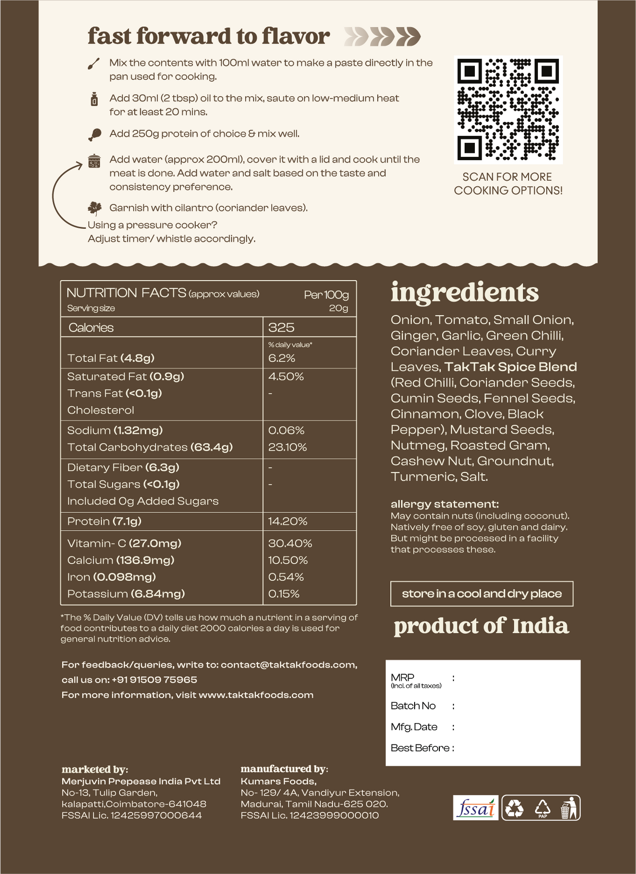 - TakTak Spice Blend (Red Chilli, Coriander Seeds, Cumin Seeds, Fennel Seeds, Cinnamon, Clove, Black Pepper, Mustard Seeds, Nutmeg)
