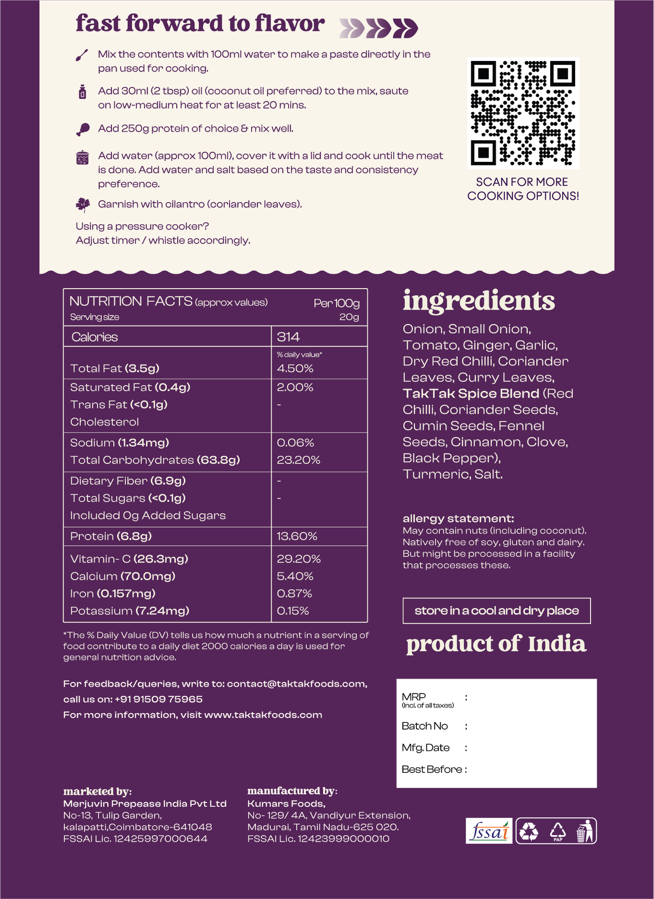 - TakTak Spice Blend (Red Chilli, Coriander Seeds, Cumin Seeds, Fennel Seeds, Cinnamon, Clove, Black Pepper)