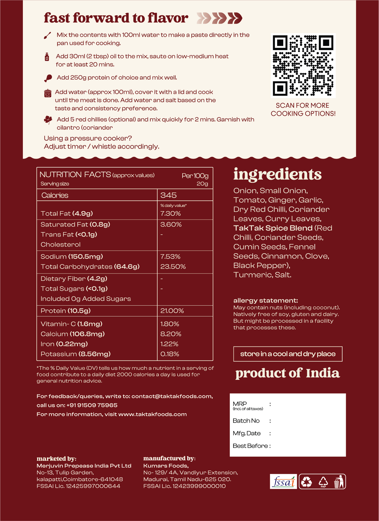 - TakTak Spice Blend (Red Chilli, Coriander Seeds, Cumin Seeds, Fennel Seeds, Cinnamon, Clove, Black Pepper)