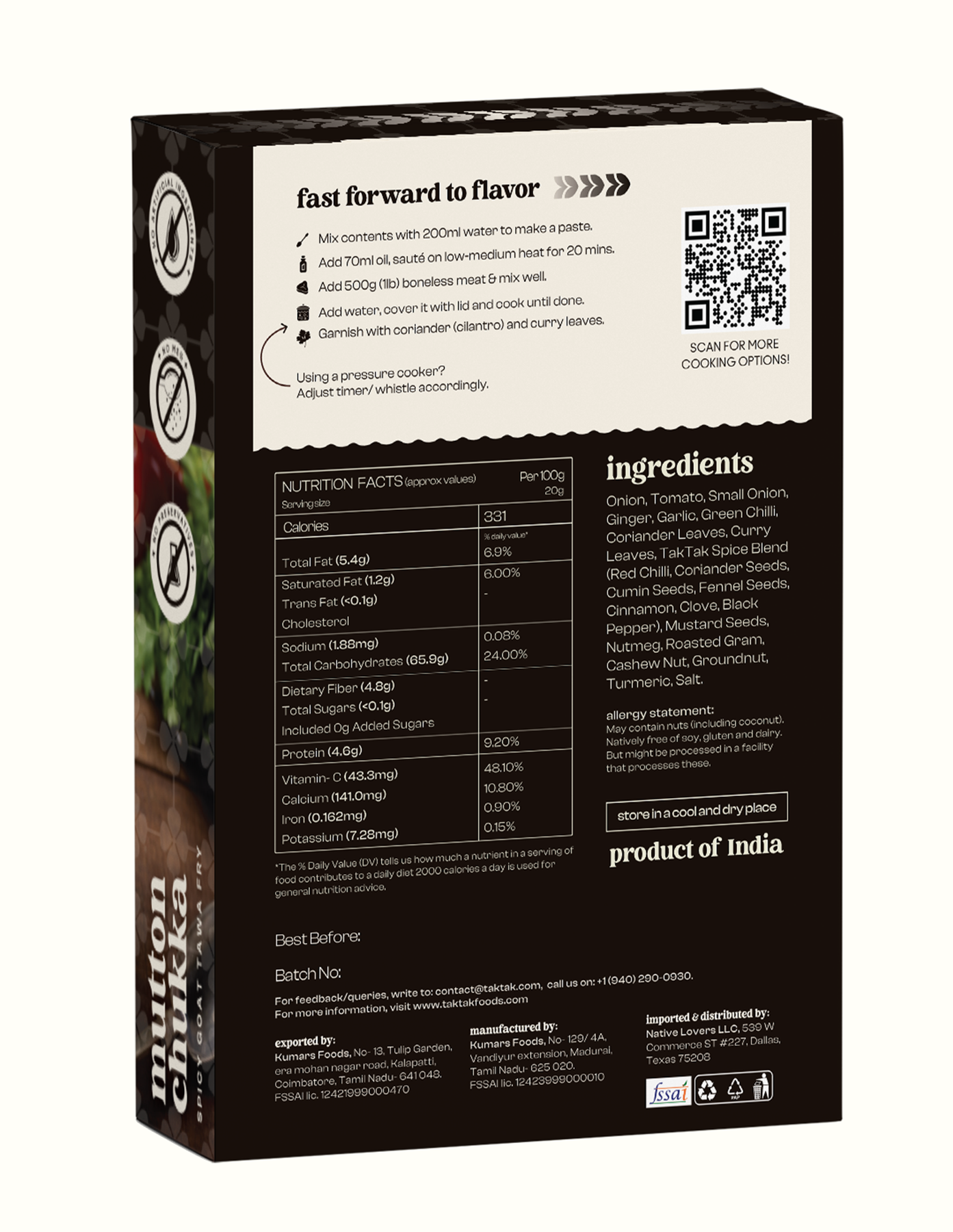 - TakTak Spice Blend:(Red Chilli , Coriander Seeds , Cumin Seeds , Fennel Seeds , Cinnamon , Clove , Black Pepper)